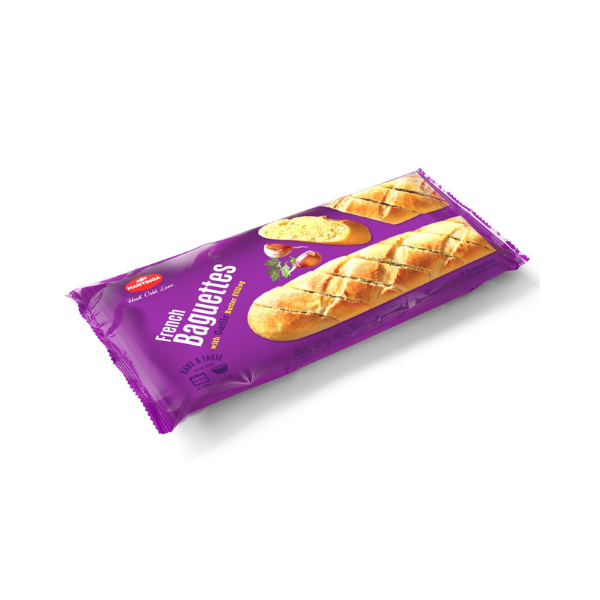 Французский багет с чесночным маслом Mantinga приготовлены из воздушного теста с добавлением натурального чесночного масла. Благодаря этому они приобретают аппетитный аромат, мягкую текстуру внутри и хрустящую золотистую корочку снаружи. Достаточно разогреть багет в духовке — и он превращается в свежую ароматную выпечку за считанные минуты.